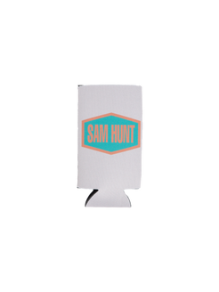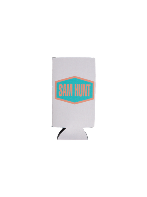 Tan tall boy koozie with the Sam Hunt logo printed on both sides.